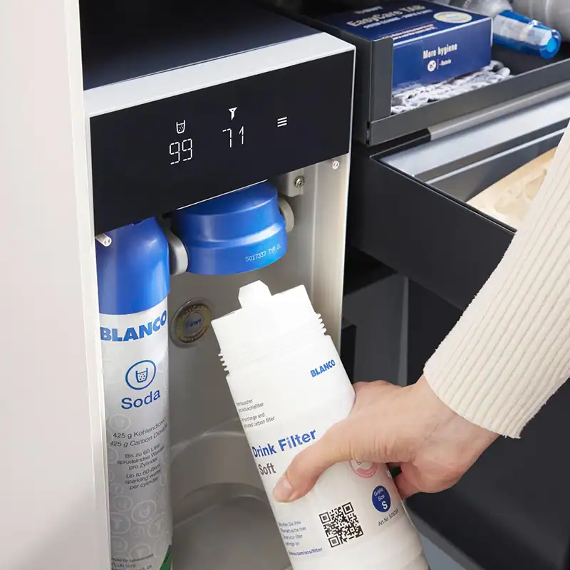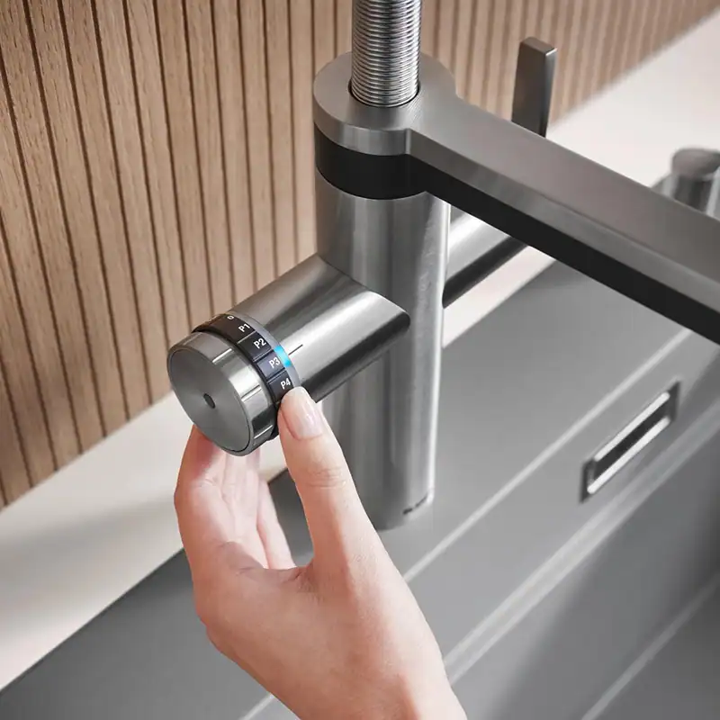 Der Wasserhahn Blanco Choice Icona liefert gefiltertes Wasser, das gekühlt, mit Kohlensäure (still, mittel, klassisch) oder kochend heiß sein kann, zusätzlich zum normalen kalten und warmen Leitungswasser