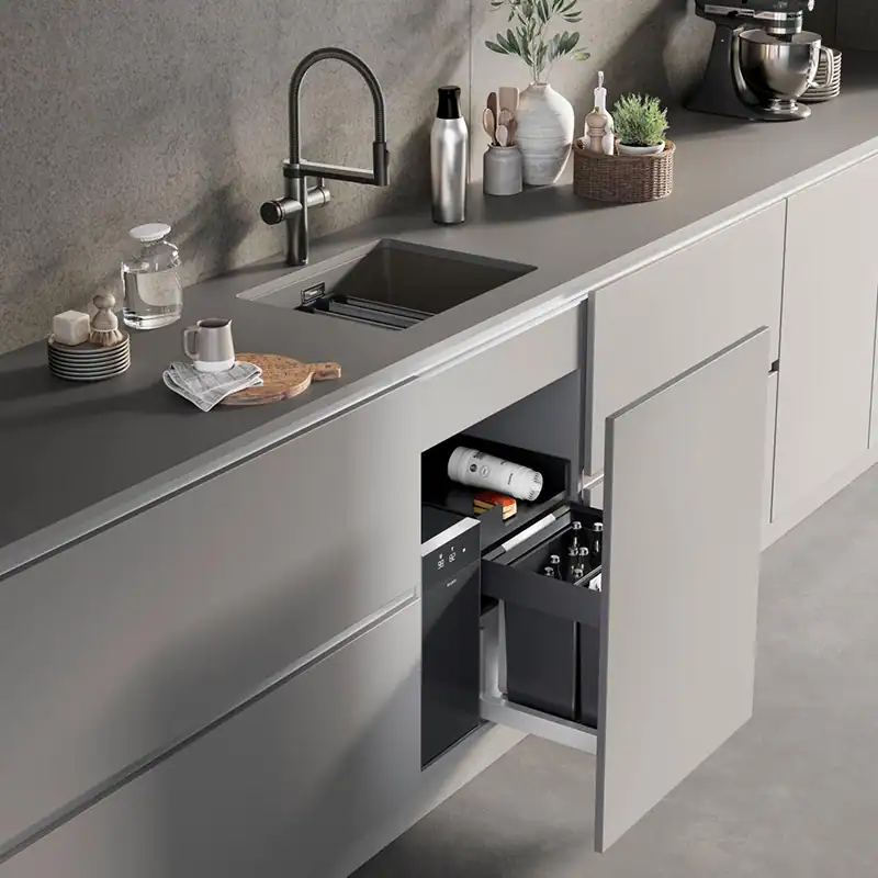 - Intuitive Bedienung des Wasserhahns mit einem separaten Hebel für Leitungswasser auf der rechten Seite und einem Drehrad mit Touch-Control auf der linken Seite für Optionen für aufbereitetes Wasser